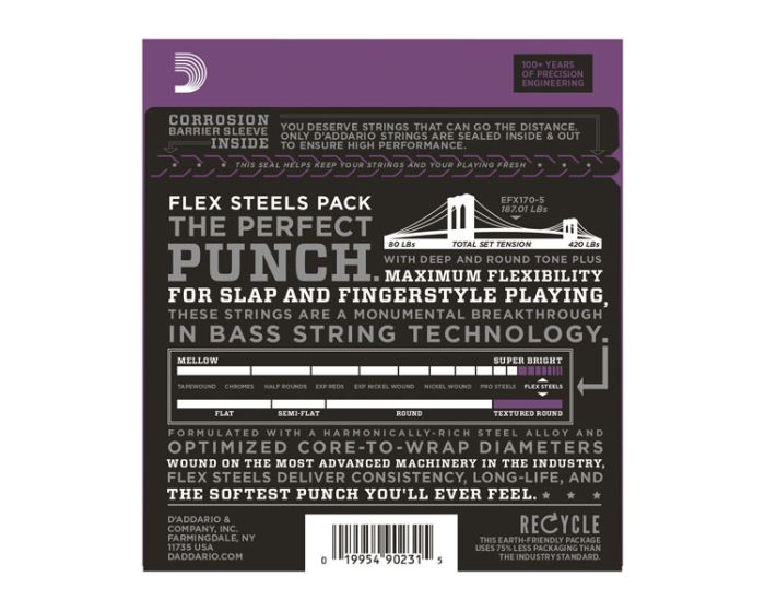 Fits long scale basses with a string scale length of up to 36 7/8 inches. A monumental breakthrough in bass string technology, FlexSteels deliver the unique combination of flexible feel optimized for slap and finger-style playing coupled with a coveted deep and round tone with just the right amount of punch and bite. A harmonic-rich steel alloy with precisely formulated core-to-wrap diameters wound to the most precise specifications delivers this singular tone and feel with unsurpassed consistency and extra-long string life.