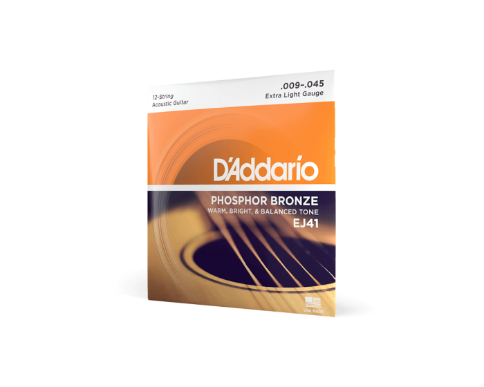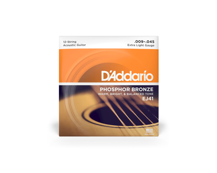 D'Addario EJ41 is an extra light gauge Phosphor Bronze set ideal for vintage instruments and ease of playability on acoustic 12-string guitars. Since D'Addario introduced Phosphor Bronze guitar strings in 1974, they have been synonymous with warm and well-balanced acoustic tone.