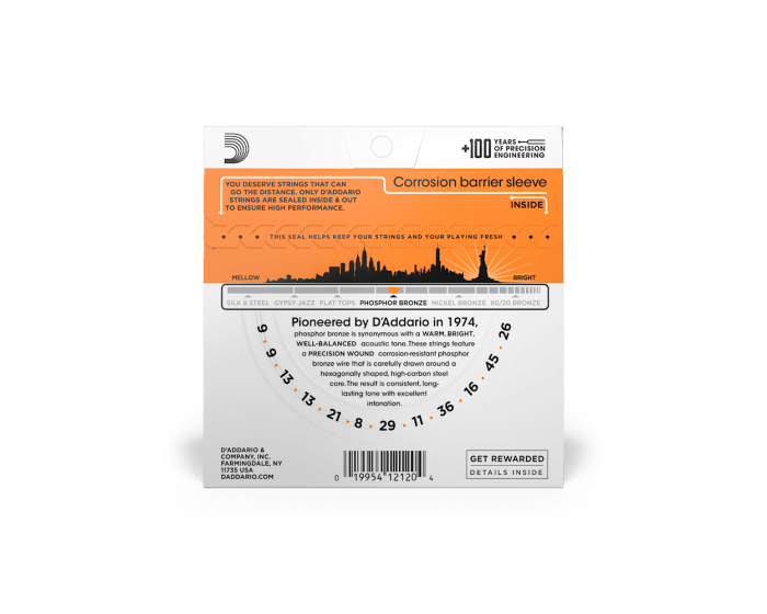Phosphor Bronze was introduced to string making by D'Addario in 1974 and has become synonymous with warm, bright, and well balanced acoustic tone. D'Addario Phosphor Bronze strings are precision wound with corrosion resistant phosphor bronze onto a carefully drawn, hexagonally shaped, high carbon steel core. The result is long lasting, bright sounding tone with excellent intonation.