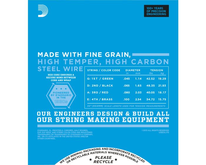 D'Addario XL Nickel Wound Electric Bass strings are world-renowned as "The Player's Choice" amongst bass players of all genres and styles. All XL strings are precision wound on our exclusive digitally-controlled machines, ensuring each string has excellent intonation, clear fundamentals, and unparalleled consistency. Each string is wound with a nickelplated steel wrap wire known for distinctive bright tone with excellent magnetic output delivering a universally appealing and versatile tone for all playing styles.