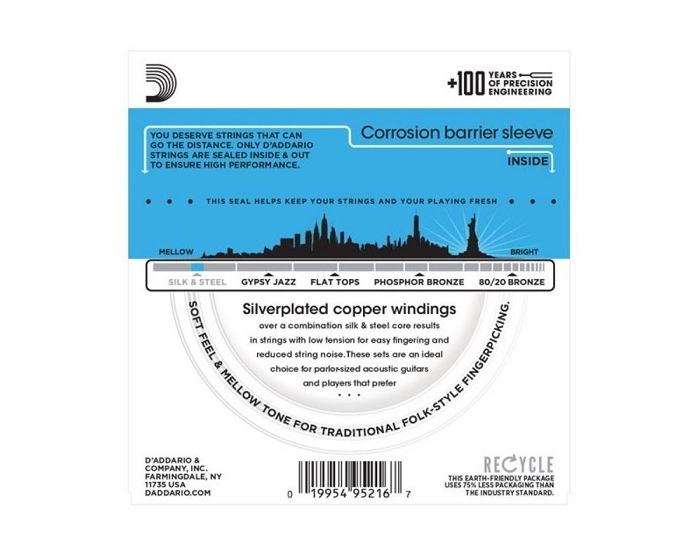 D'Addario Silk & Steel strings couple silver-plated copper wrap wire with silk for easy fingering and a mellow tone. They are excellent for smaller body acoustic guitars and preferred by many folk players.
