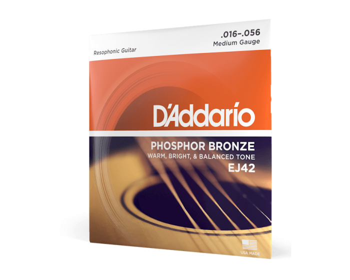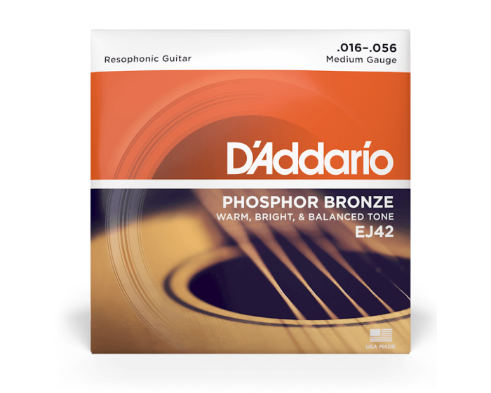 D'Addario EJ42 6-string phosphor bronze Resophonic guitar strings offer a warm, well balanced acoustic tone, optimal resistance and comfortable feel. The standard in Resophonic strings!