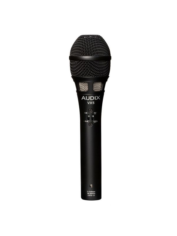 The Audix VX5 is a multi purpose, professional vocal condenser microphone designed for live, studio and broadcast applications. With an ability to duplicate studio quality sound on stage, the VX5 has a smooth and accurate frequency response, resistance to feedback and handles very high SPLs without distortion.