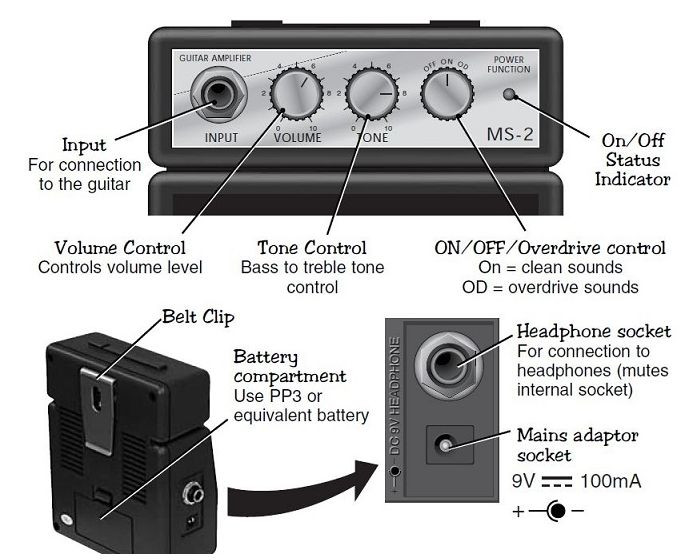 Controls: Volume, tone, select either 'On' voice or 'Overdrive' voice