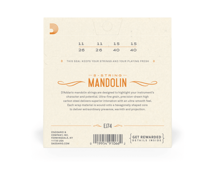 EJ74 is the world's most popular Phosphor Bronze mandolin set. Since D'Addario introduced Phosphor Bronze guitar strings in 1974, they have been synonymous with warm and well-balanced acoustic tone.