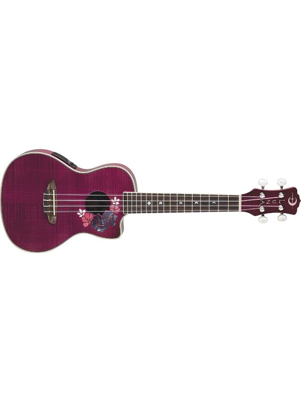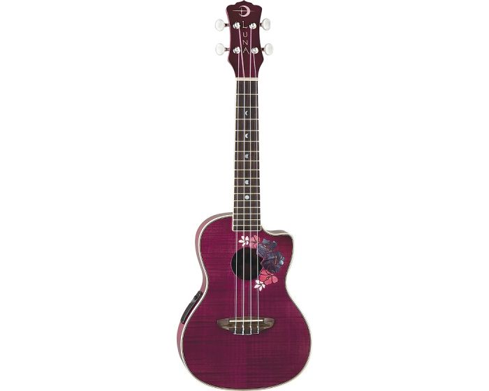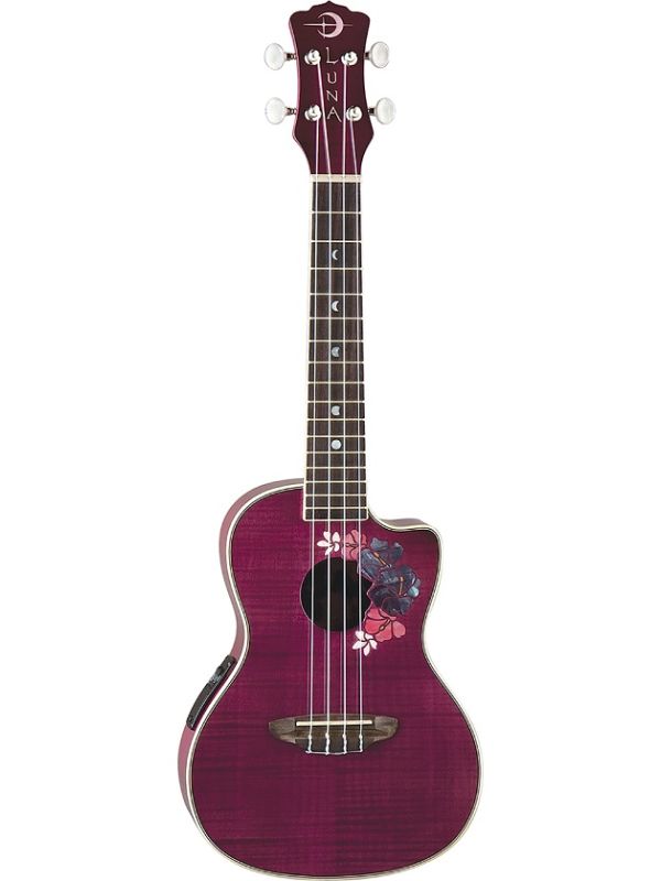 Plumeria inlays compliment the soundhoule, not to mention it is graced with delicate beauty; the national flower of Hawaii “The Hibiscus”. This beautiful Luna ukulele features a brilliant trans-purple flame maple top and a maple body, producing full, deeper sound along with the instrument's concert body size. The cutaway offers comfort when accessing the upper-register frets, and the maple neck and rosewood bridge and fretboard add lasting sustain and clarity to your tone.