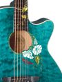 The neck design of the Flora Moonflower Custom includes inlaid mother-of-pearl and tinted abalone on mahogany. The full moon and the trumpet-shaped flowers are mother-of-pearl inlays. The leaves and vine and moth are inlaid abalone tinted shades of green and red.