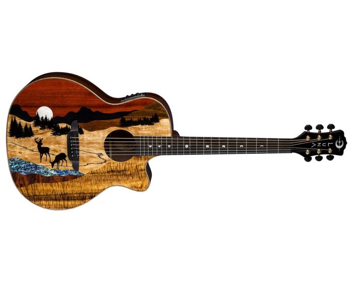 The Vista Series Deer model showcases a skillfully crafted top, made from attractive tone-woods that bring its unique panoramic image to life. Handmade from a combination that includes Paduk, Mother of Pearl, Blackwood, Cocobolo, Spalted Maple, Teal Abalone, Bubinga, and Koa, each guitar is a completely unique work of art. The Vista Deer features a gloss finished, flamed maple bound, Grand Concert body with choice Koa back and sides for enhanced tone and projection. Precision fitted with a hand-shaped 25 scale Mahogany neck and capped with a smooth, Pearl Moon Phase inlaid Ebony fretboardthe Vista Deers feel, playability, and stand-alone acoustic sound are nothing short of inspirational.