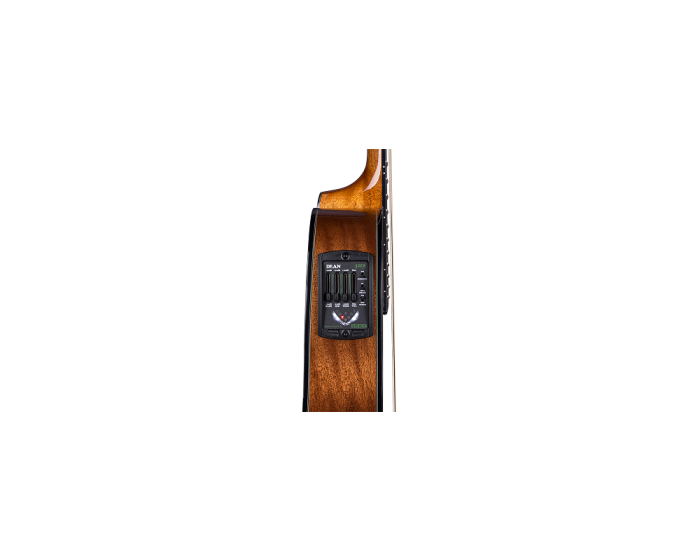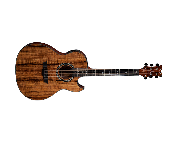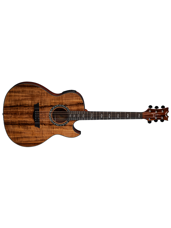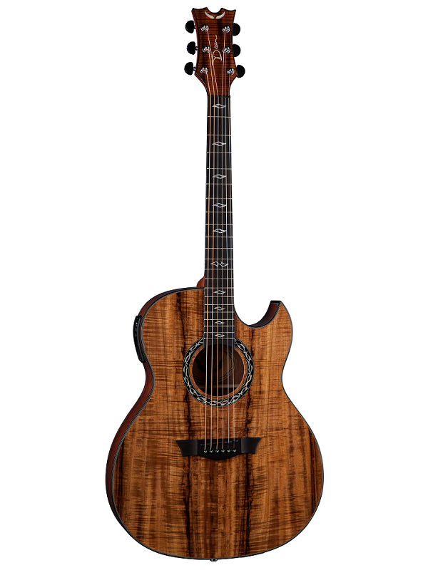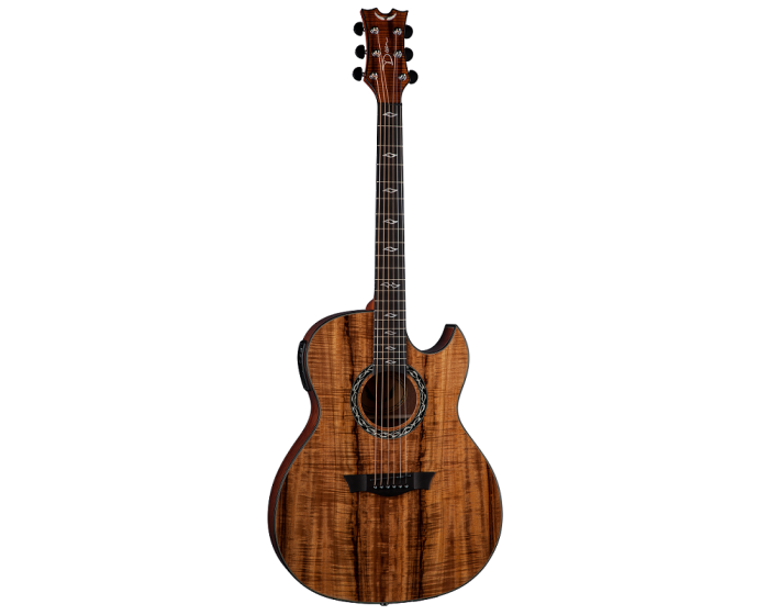 The Dean Exhibition Acoustic-Electric Guitar is designed to be a perfect companion onstage. Made with a mahogany body and beautiful KOA exotic wood top, the thin body of the Exhibition adds comfort while helping to reduce feedback when plugged in. The slim D-shaped profile of the set mahogany neck is extremely comfortable for electric guitarists and features a 24-1/4" scale. Appointments include a smooth ebony fingerboard, pearl Ultra Diamond inlays, black NuBone nut & saddle, Grover tuners, and a Fishman Isys+ preamp with built in tuner. Dean Exotics are the most massive sounding acoustics available.