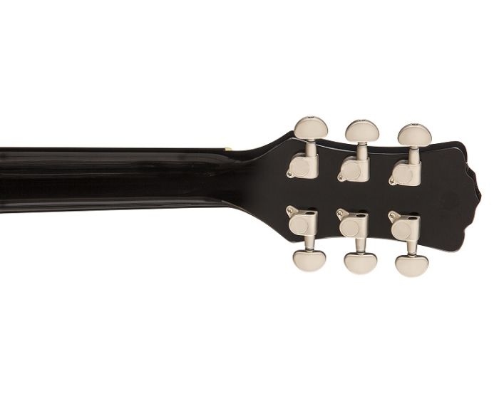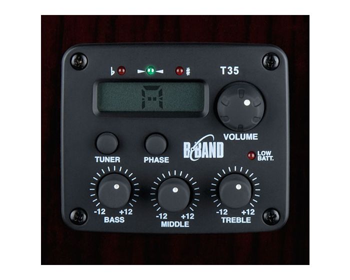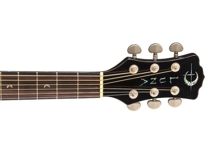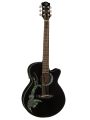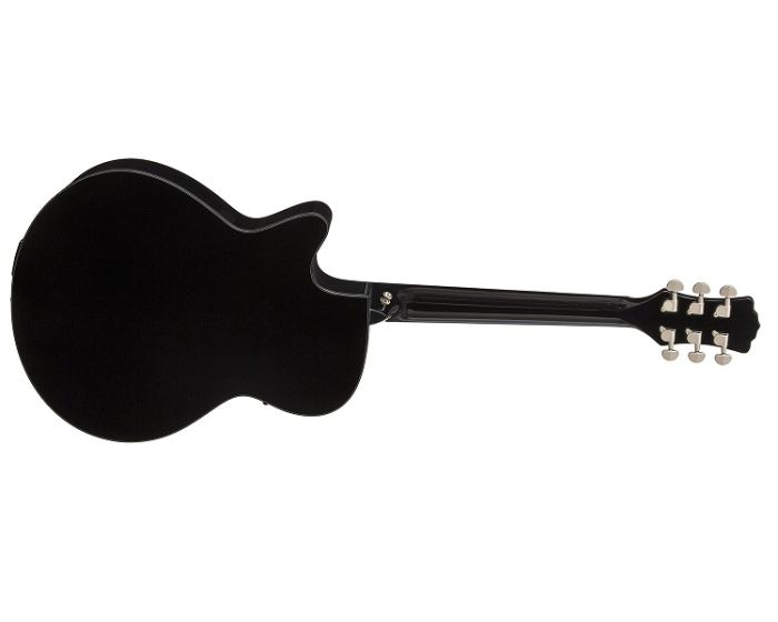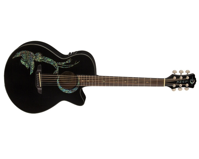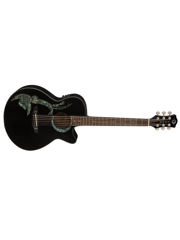 This folk style cutaway is constructed of select spruce and mahogany. The soaring bird in abalone is stunning against the black lacquer-look finish.