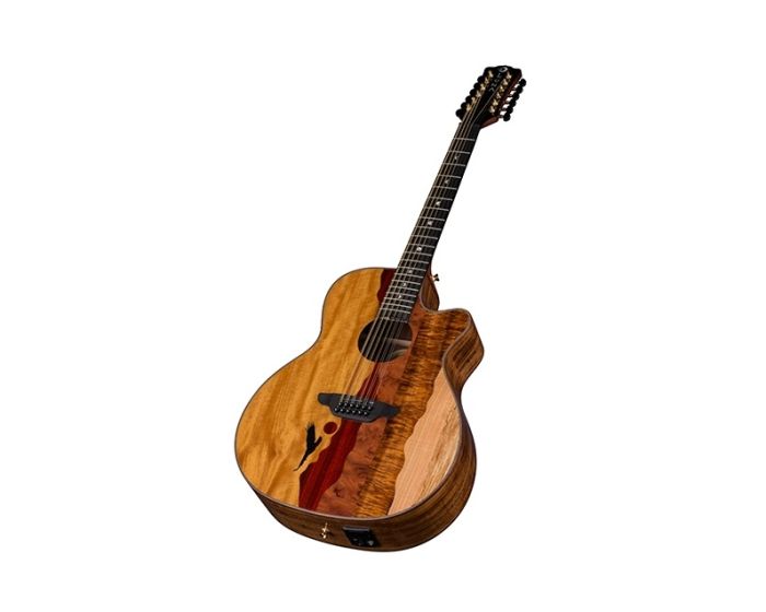 The Vista Series blurs the line between the world of fine art and the art of advanced acoustic guitar building. One can expect high-level craftsmanship and rich, warm sound, Luna acoustics have long been sought after for their remarkable aesthetics. The Luna Vista Eagle 12 String showcases a skillfully crafted top, made from attractive tone-woods that bring its unique panoramic image to life. Handmade from a combination that includes Movingal, Paduk, Quilted Mahogany, Koa and Spalted Maple, each guitar is a completely unique work of art. This Vista Eagle features a gloss finished, flamed maple bound, Grand Concert body with choice Koa back and sides for enhanced tone and projection. Precision fitted with a hand-shaped 25 scale Mahogany neck and capped with a smooth, Pearl Moon Phase inlaid Ebony fretboard the Vista Eagles feel, playability, and stand-alone acoustic sound are nothing short of inspirational. Once plugged in, the Vista Eagle takes off in yet another sonic direction. Owing to a Fishman Presys+ 201 preamp/tuner and Fishman Sonicore pickup, the Vista Eagle offers clear, strong, natural acoustic sound on stage even when going against dense instrumentation. Whether plugged-in or not, the Vista series incredibly full tone, pristine clarity, and unique visual presence make it the ideal instrument to make your musical statement.