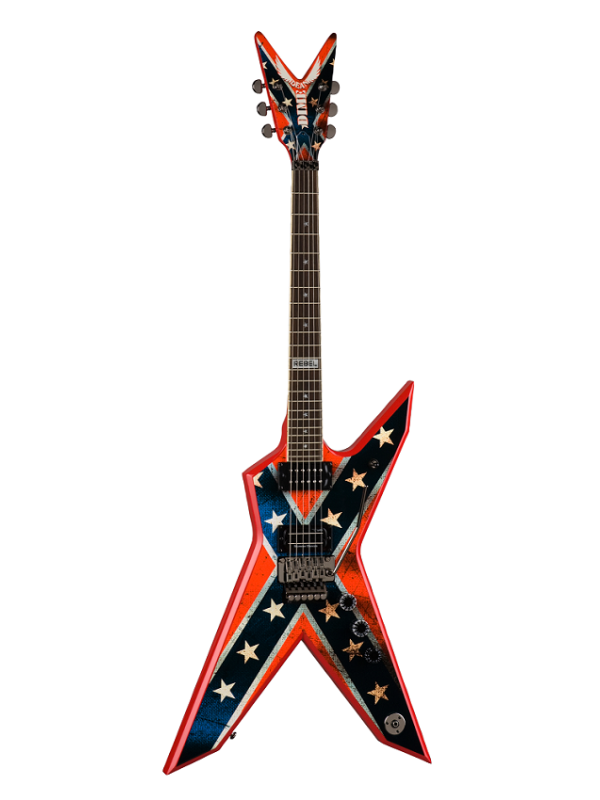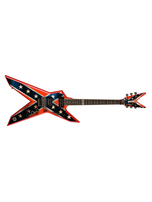 Now you can own the Dimebag Dixie Rebel - an electric guitar designed by Dimebag himself. Dimebag Darrell was a walking textbook of modern metal guitar techniques, liberally spraying bone-crushing power chords, dissonant intervals, tremolo arm insanity, and a shredding lead voice worthy of the masters. The Dixie Rebel guitar features an ML shape with sharp corners to enhance the rebel flag design. The graphic looks like a real fabric flag that has been to battle. Star inlays on the rosewood fretboard are highlighted by a REBEL inlay at the 12th fret.