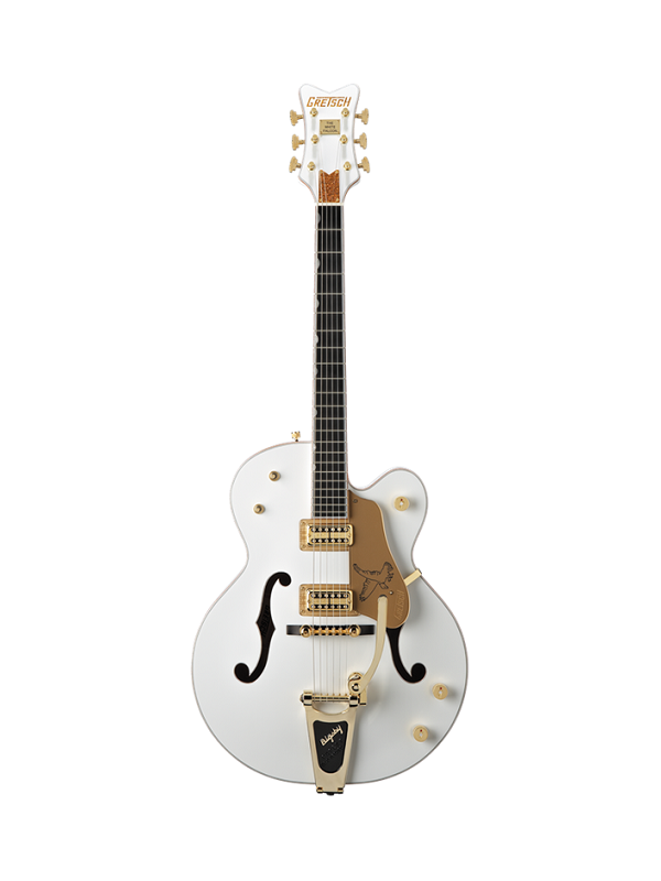 Other features include dual High Sensitive Filter’Tron™ humbucking pickups, three-position pickup switch, three-position master tone switching, gold plexi pickguard with falcon motif, Space Control™ bridge, gold-plated Grover® Imperial™ tuners, horizontal Gretsch® gold-sparkle headstock logo and a Bigsby® B6GB vibrato tailpiece.