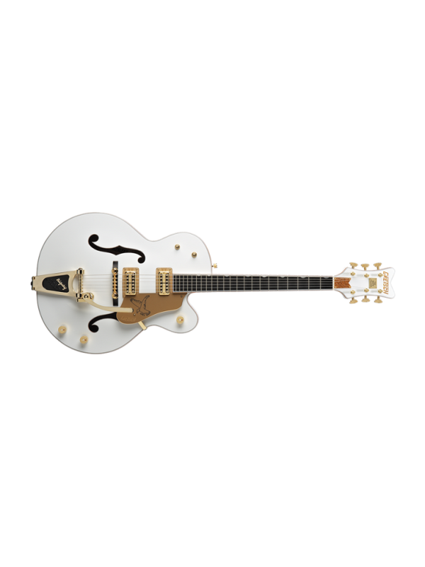 UNIQUE FEATURES: V-Shaped Falcon Headstock with Horizontal Gretsch Logo, Neo Classic "Thumbnail" Inlay Position Markers, Gold-Sparkle Fingerboard and Headstock Bindings, Oversized Bound F-Holes, Multiple Gold-Sparkle Body Bindings, Gold-Sparkle Inlaid Gretsch Logo on Headstock, Gold Plexi Dove-Style Pickguard with Falcon Detail, Knurled Strap Retainer Knobs, Adjustable Truss Rod