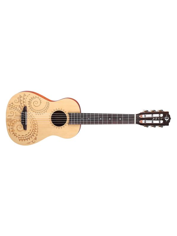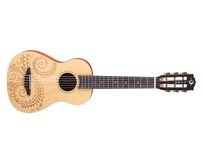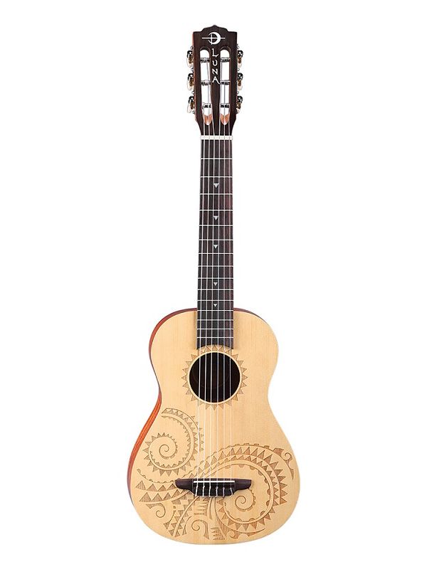The Luna Tattoo 6 String Baritone Uke is for any guitar players who secretly covet the portability & convenience of a ukulele. You can stash it in your cubicle, your car, on the coffee table, or wherever you'd enjoy a spontaneous jam. Made of a select spruce top with mahogany back, sides, and neck, and rosewood fingerboard, this 30" baritone bodied uke features a beautiful laser-etch tattoo design by henna artist Alex Morgan. Features include a select Spruce top, Mahogany body and open gear tuners to help maintain proper intonation.