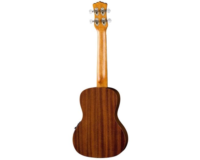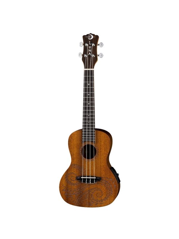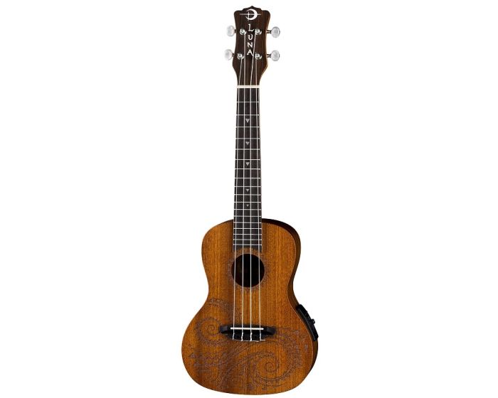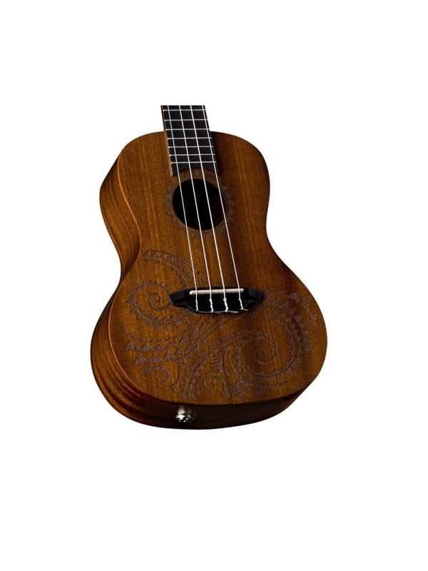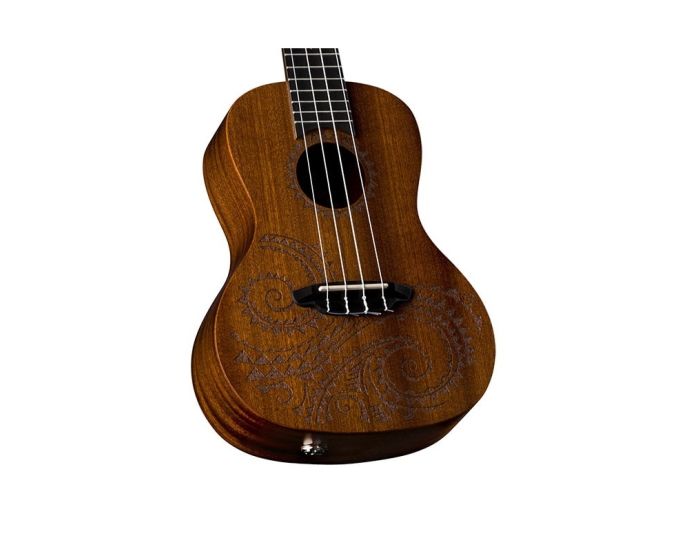 This traditional concert uke takes its design from traditional hawaiian body ornamentation. Those designs were monochromatic, tattooed in black against brown skin, with strongly geometric patterns, and many shapes and symbols inspired by the natural island world: stones, waves, fish, sharks, turtles, rain, sun, birds. The design is primarily based on waves and sharks teeth which are also echoed as fret markers. This concert Uke adds the advantage of an onboard preamp and boasts a clear, resonate sound both by virtue of its Concert body and Mahogany construction. Beautiful sound - tremendous value.