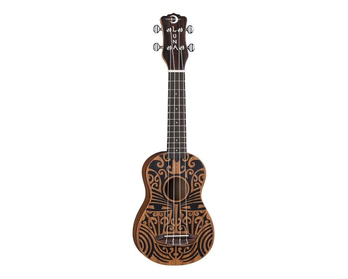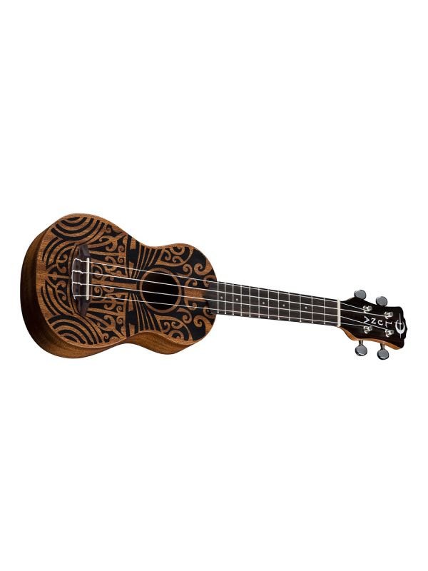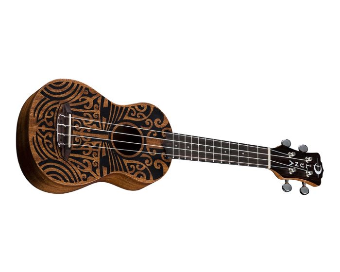 Luna's tribal line of mahogany ukes combine the best of traditional profiles and wood selection with Hawaiian body ornamentation, entwined guardian spirits, and contemporary longings. This Tribal Soprano Mahogany Uke takes its design from traditional Pacific carvings.