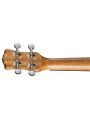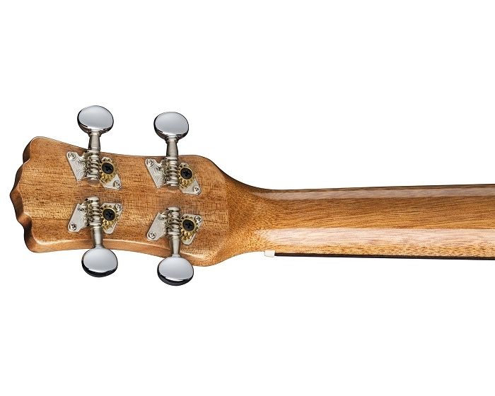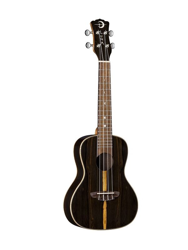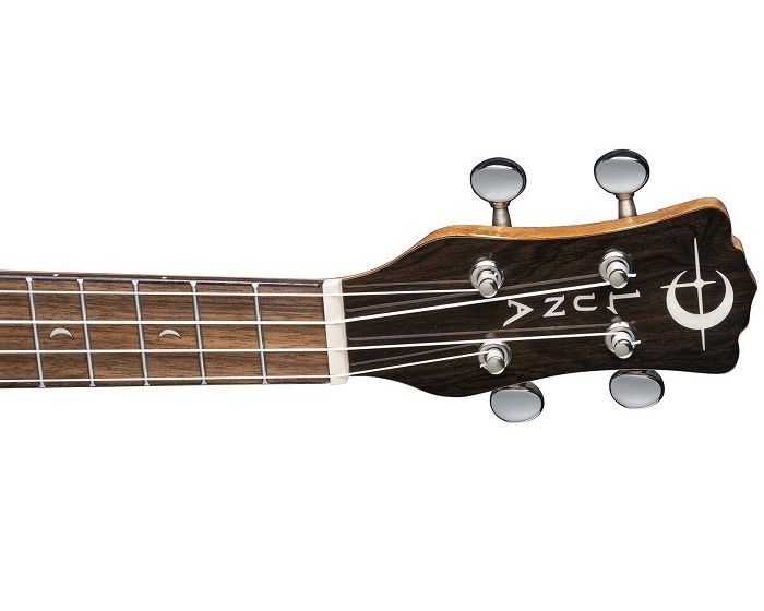 Ziricote offers a captivating color scheme and unique wood grain pattern, which consists of a majority dark brown shade and grain lines that reflect spider webs or marbled swirls. This motif contrasts nicely with the golden vanilla sapwood streak running down the middle - a very stunning combination and all protected by a light layer of gloss. Folks will certainly enjoy this ukuleles natural beauty. The Ziricote uke is built on a traditional concert body, walnut bridge and fretboard, 15 scale length and beautiful pearloid moon phase inlays. Expect warm boomy sound with sparkly highs from the ziricote body and easily keep that rhythm in tune with chrome open gear tuners.