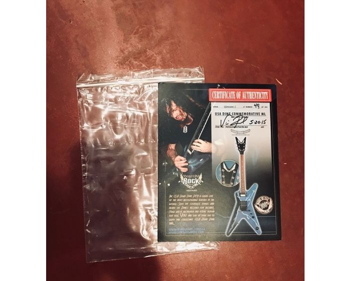 This Dean USA Commemorative Dime from Hell #49 of a limited run of 100 can be yours. Letter of Authenticity was signed by Vinnie Paul. “Hand crafted in the Dean Guitars Custom Shop, Tampa Bay, FL”