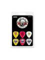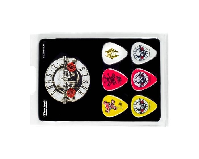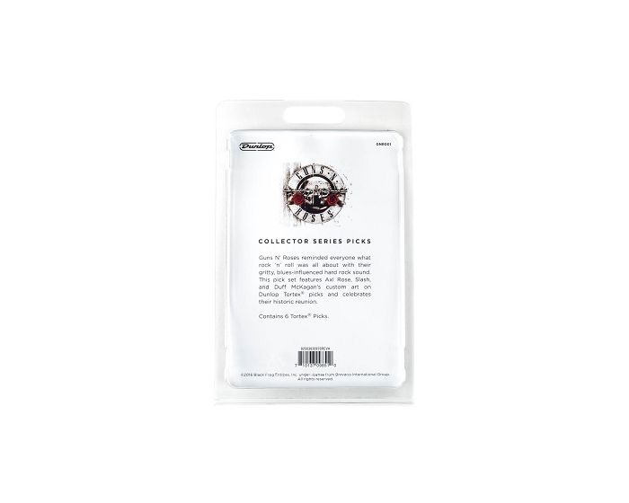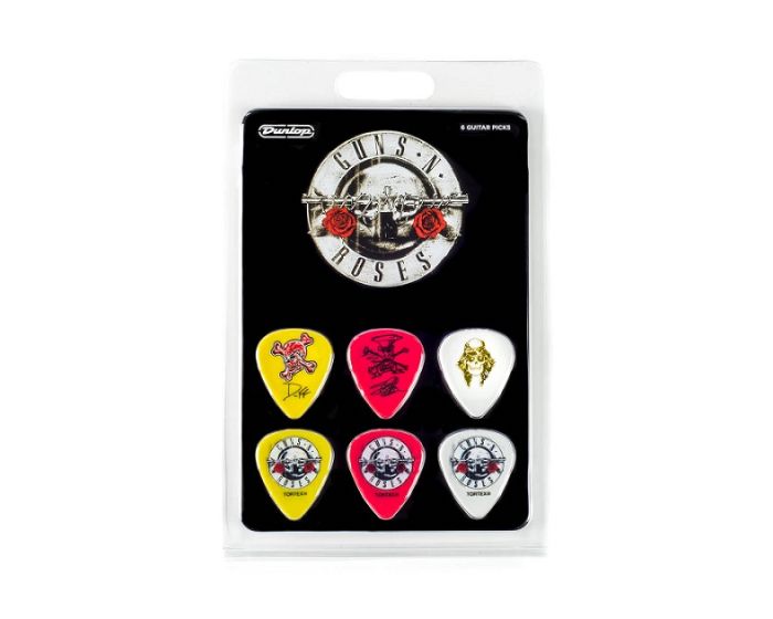 Get a little good ol' rock n' roll from LAWK STAR Guitars; Guns N' Roses reminded everyone what rock 'n' roll was all about with their gritty, blues-influenced hard rock sound. This pick set features Axl Rose, Slash, and Duff McKagan's custom art on Dunlop Tortex® picks and celebrates their historic reunion. Contains 6 Tortex® Picks.