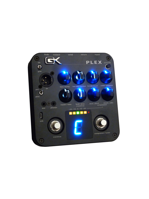 The heart of every GK product is the active 4 band “variable Q” equalizer and contour circuit that set the standard for bass tone shaping over 30 years ago. Building on this proven foundation, the PLEX features expanded filter options that allow you to further dial in your instruments unique voice. Foot switchable Compressor and Overdrive ensure your performance blends seamlessly into the band or cuts through a crowded mix and the Chromatic Tuner makes sure it’s all in tune. The ¼” output drives the front of your instrument amp or power amplifier while the DI output sends it all to the PA or recording console. Aux IN and Phones Out make the PLEX ideal for jamming along silently with your favorite tunes and the USB input/output allows pristine digital recording and re-amping capability when used with your favorite recording software.