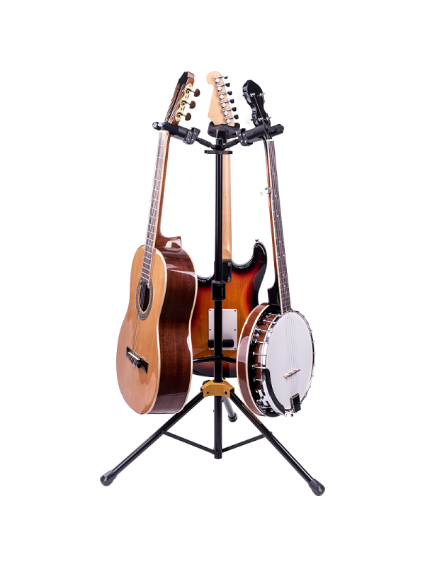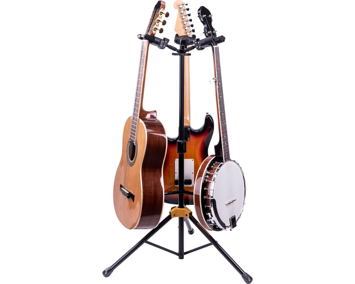 The HERCULES Triple Guitar Stand GS432BPLUS accommodates three instruments and features the foldable Auto Grip System (AGS) yokes, Instant Height Adjustment Clutch, Specially Formulated Foam (SFF) padding contacts and the adjustable back rests.